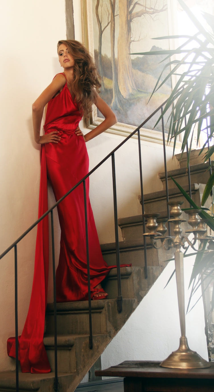Lady in Red: Model Maria Frediani in a NIKOLAKI Nick Verreos/David Paul red silk bias-cut gown with cowl front, asymmetrical back and back cowl drape/fall detail--Bargellini Palace Photographs by Jerry Lee Ingram
